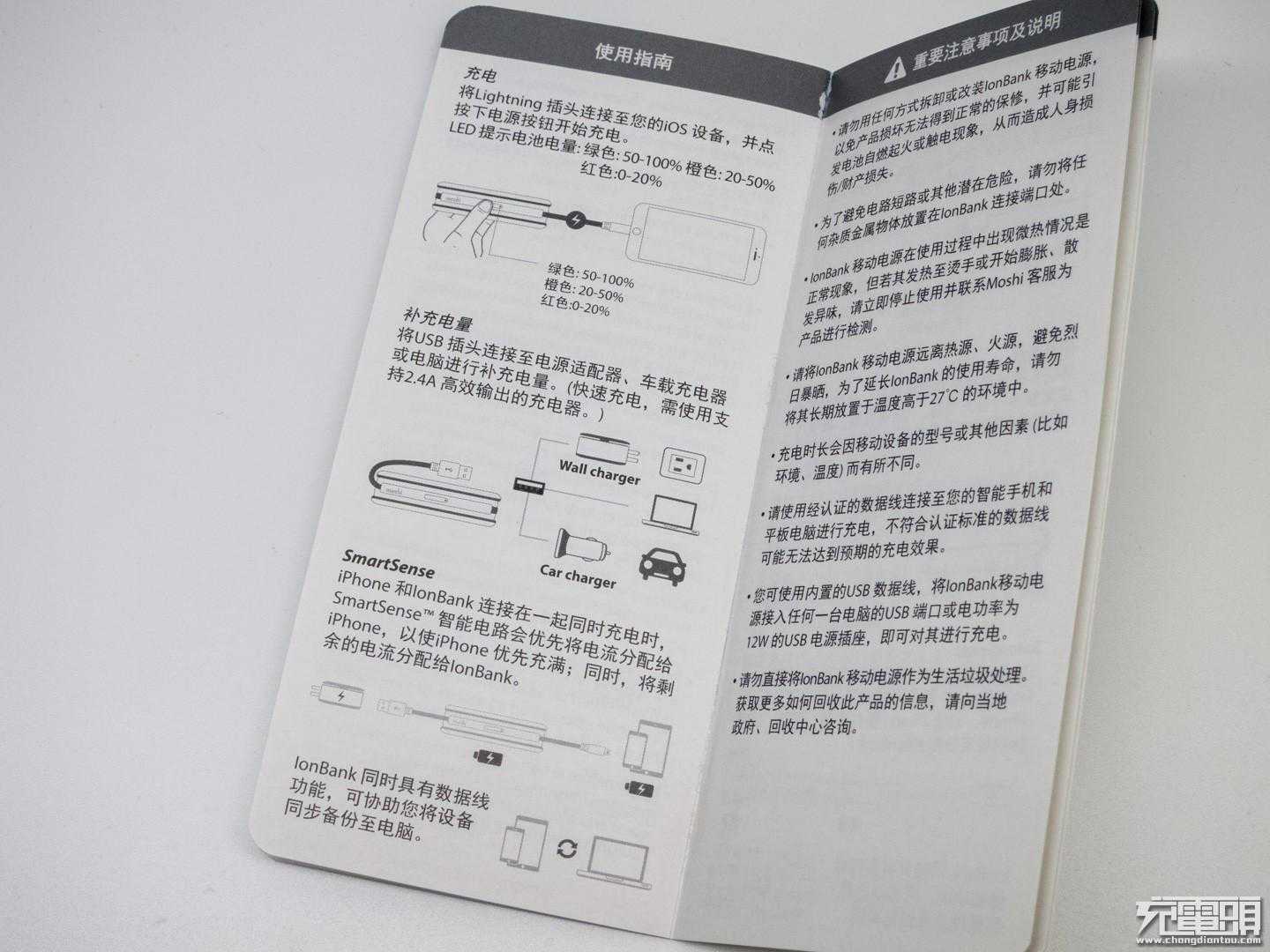 先了解一下说明书,采用多国语言标注,我们看一下中文,快速充电请使用支持2.4A高效输出的充电器,IonBank具有数据线功能,可协助将设备同步备份至电脑。