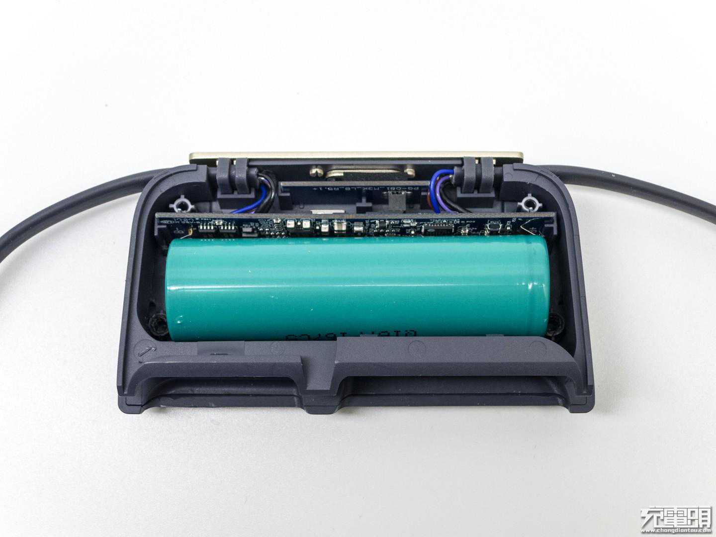 IonBank3K移动电源内部采用单节18650电芯,PCB板两端分别焊接了USB输入Lightning输出线缆。