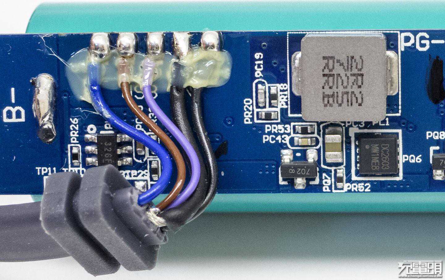 PCB正面一览,B+B-镍带过孔焊接,数据线焊点圆润浸润度很高,采用5线焊接最粗的是屏蔽网也焊接其中,数据线还可以传输数据,线束并用胶水固定,工艺无可挑剔。最大的是2R2电感,PCB上有PG081M3KPB字样,PCB上元器件排列整洁规范,好的设计就是不一样,十分养眼。