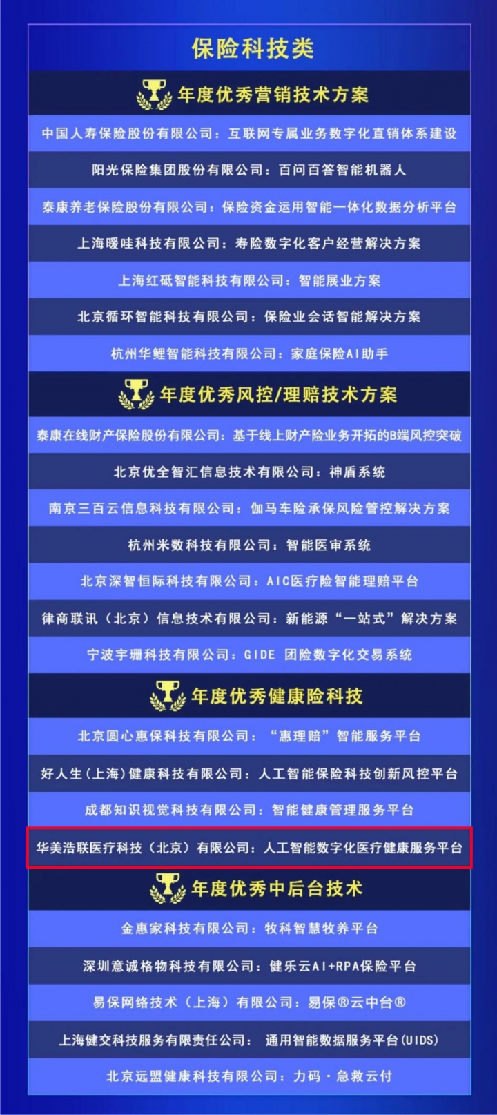 此次荣获保观“InsurStar2023年度优秀健康险科技”殊荣亦是对「华美浩联」在保险行业做出的创新与努力的有力肯定。未来,华美浩联将坚守初心,继续拓展应用场景,升级服务和技术水平,以B2B2C的模式,以“全流程服务+AI技术”为核心竞争力,持续深化与保险公司、银行金融机构以及企业的深度合作,为其提供获客、增值、风控、健康险产品创新、员工健康福利等全方位的解决方案,共建健康保障生态,努力帮助更多年轻人、老年人或是健康、慢病、高价值学科等人群更理性地、科学地选择到真正适合自己的健康险产品,享受到数字化、智能化、高质量的医疗健康服务,致力于“让中国家庭实现健康小康”。