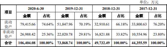 2017年至2020年1-6月,艾为电子资产总额分别为4.44亿元、4.97亿元、7.39亿元、10.64亿元,其中,流动资产分别为3.38亿元、3.29亿元、5.18亿元、7.94亿元,非流动资产分别为1.06亿元、1.68亿元、2.20亿元、2.70亿元。
