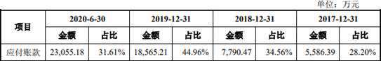2017年至2020年1-6月,艾为电子应付账款分别为5586.39万元、7790.47万元、1.86亿元、2.31亿元,占流动负债比例分别为28.20%、34.56%、44.96%、31.61%。