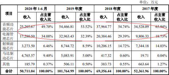 2017年至2020年1-6月,艾为电子音频功放芯片产品收入占主营业务收入比例分别为65.94%、54.74%、53.52%、49.70%,电源管理芯片产品收入占主营业务收入比例分别为18.73%、29.39%、32.39%、34.08%。