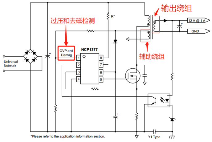 如下NCP1377的去磁检测,磁芯复位检测是通过检测辅助绕组上电压变化来完成。这个电压表达了反激的极性(同磁芯的绕组,根据同名端判断),典型的电平检测是50mV
