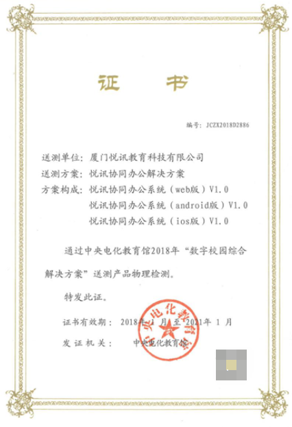 由中央电化教育馆组织的2018“数字校园综合解决方案”评选合格名单公布。厦门悦讯信息科技股份有限公司(以下简称“悦讯科技”)申报的三大解决方案——“悦讯区域智慧教育云服务平台”、“悦讯办学成果评估解决方案”“悦讯协同办公解决方案”经严格的资质审核、方案筛选、功能检测后均强势入选,并获得中央电教馆颁发的方案认定证书。悦讯科技的教育产品再次得到了国家权威教育部门的认可!