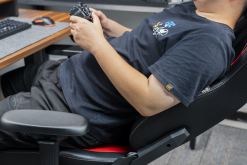 对了,它的扶手部分也很好玩,高度、左右倾斜等都能自由调节,我喜欢把它调到最高,和桌面保持一个完美的高度差距,在使用键鼠的时候可以托起手臂,时间久了不会累。而且在玩手游的时候也能支撑手肘,看来电竞椅已经不是端游玩家的专属了!