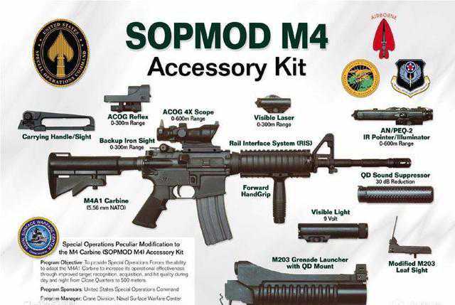 如图所示,SOPMOD计划是由USSOCOM、海军特种作战部队、空军、陆军海军等多军种联合提出,并委托海军武器研究中心负责研究的。1999年5月开始在海军和空军提供以M4A1卡宾枪为武器平台的SOPMOD进行试验。
