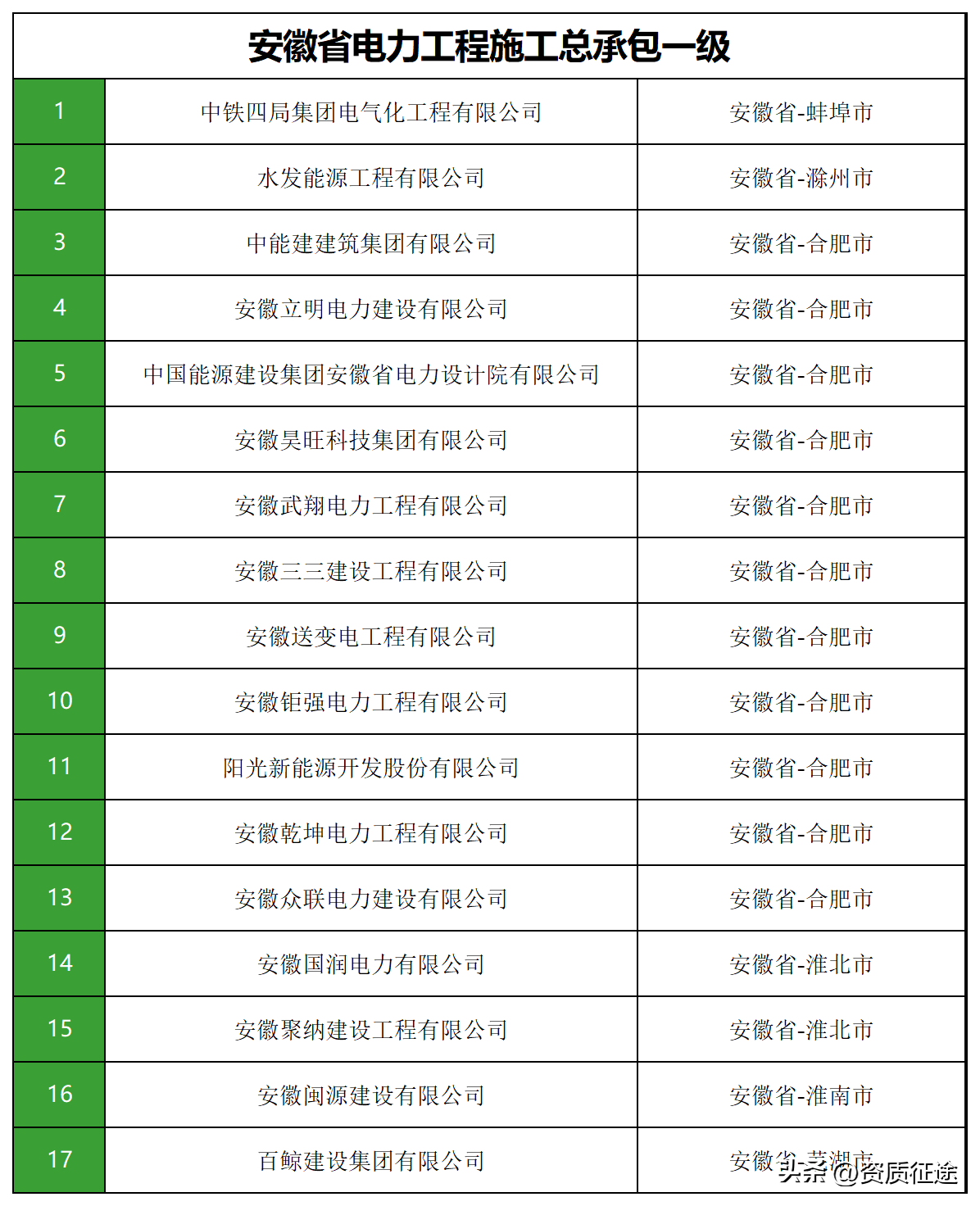安徽省电力工程施工总承包一级企业共有17家。这些企业在电力工程建设和运营中扮演着重要角色。他们参与了火力发电、水力发电、风力发电等项目的建设,为安徽省的电力供应和能源结构优化做出了贡献。