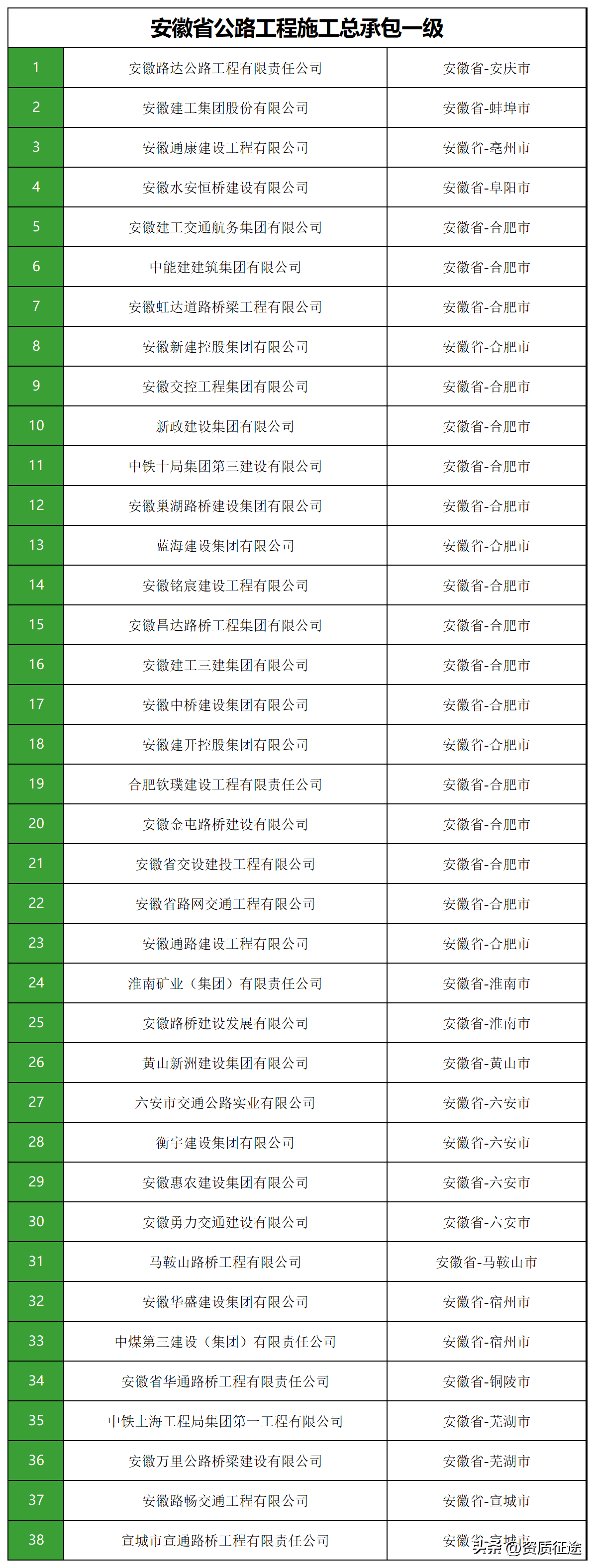 安徽省公路工程施工总承包一级企业数量为38家。这些企业在公路建设和改造方面发挥着重要作用。他们承建了高速公路、国省道、城市道路等各类公路工程,为安徽省的交通事业发展提供了有力支撑。