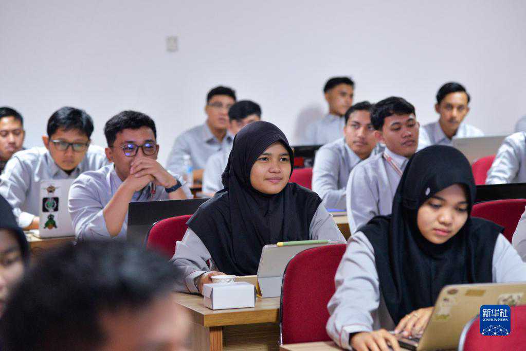 6月7日,在位于印度尼西亚茉莉芬市的印尼铁路理工学院,应急值守人员培训班学员尼斯丽娜(中)参加培训。新华社记者徐钦摄