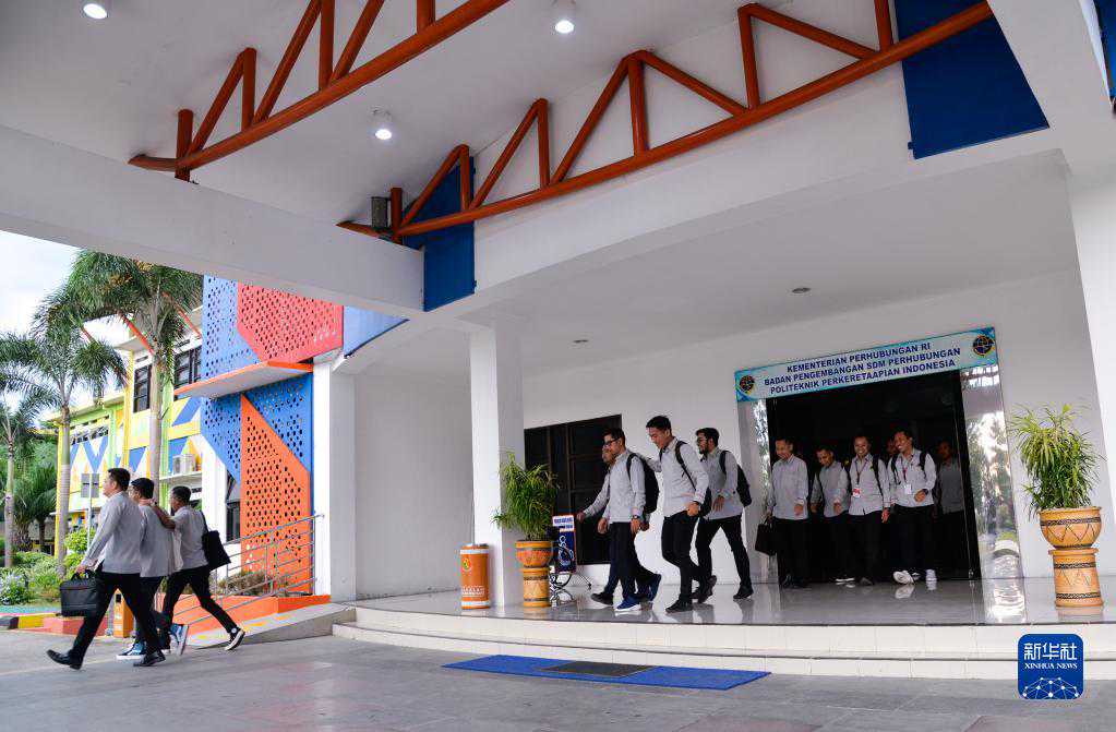 6月7日,在位于印度尼西亚茉莉芬市的印尼铁路理工学院,雅万高铁动车组司机培训班学员走出教学楼。新华社记者徐钦摄