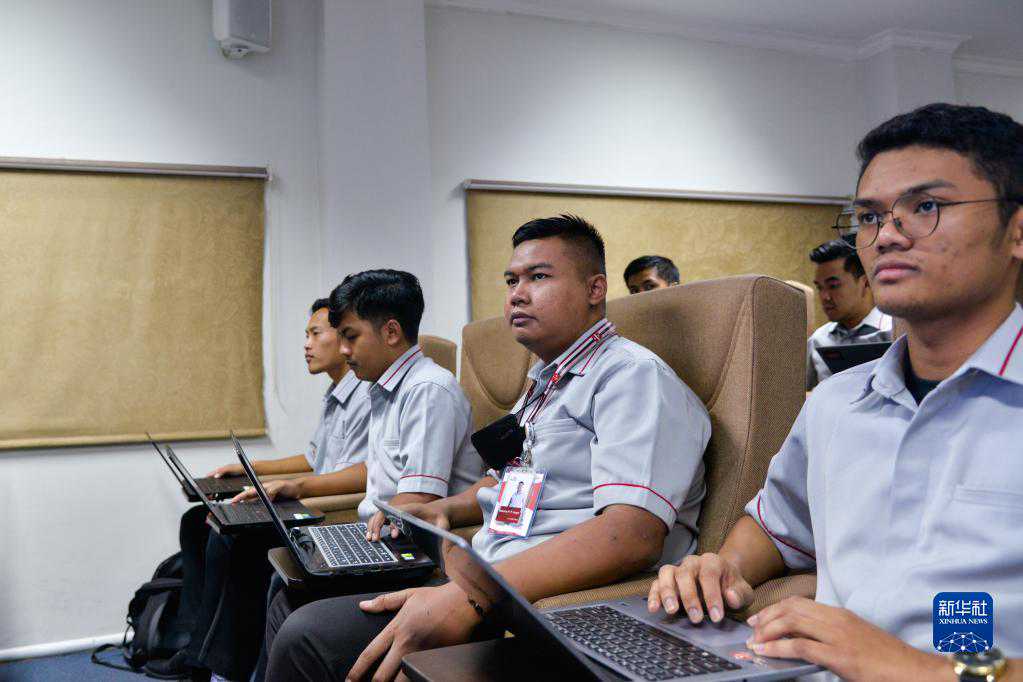 6月7日,在位于印度尼西亚茉莉芬市的印尼铁路理工学院,动车组机械师培训班学员巴哈纳(前右二)参加培训。新华社记者徐钦摄