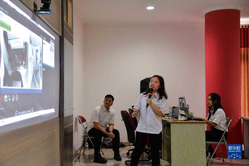 3月20日,在位于印度尼西亚茉莉芬市的印尼铁路理工学院,中国员工刘淑媛(中)在雅万高铁首批运维人员培训班上担任翻译。新华社记者徐钦摄