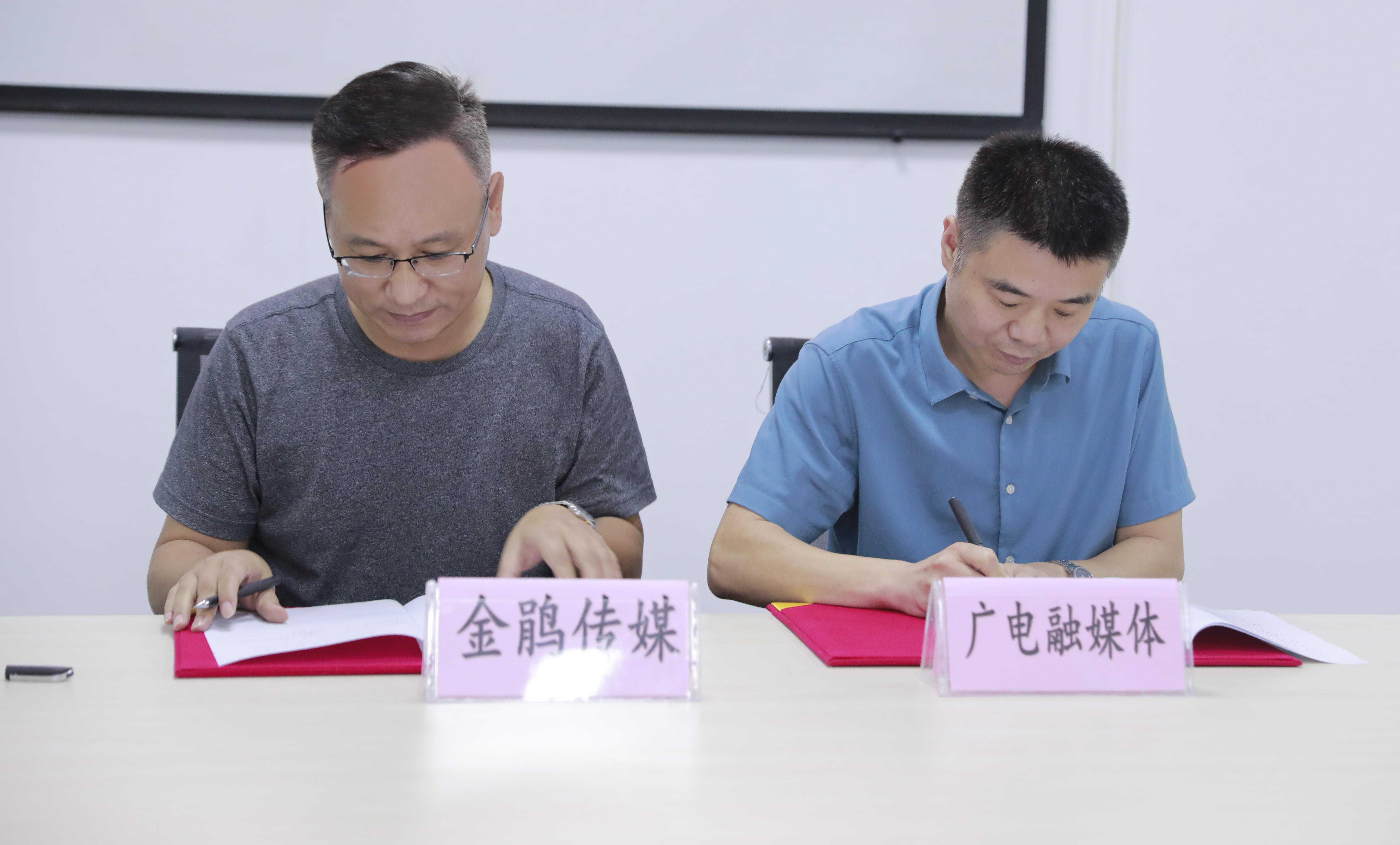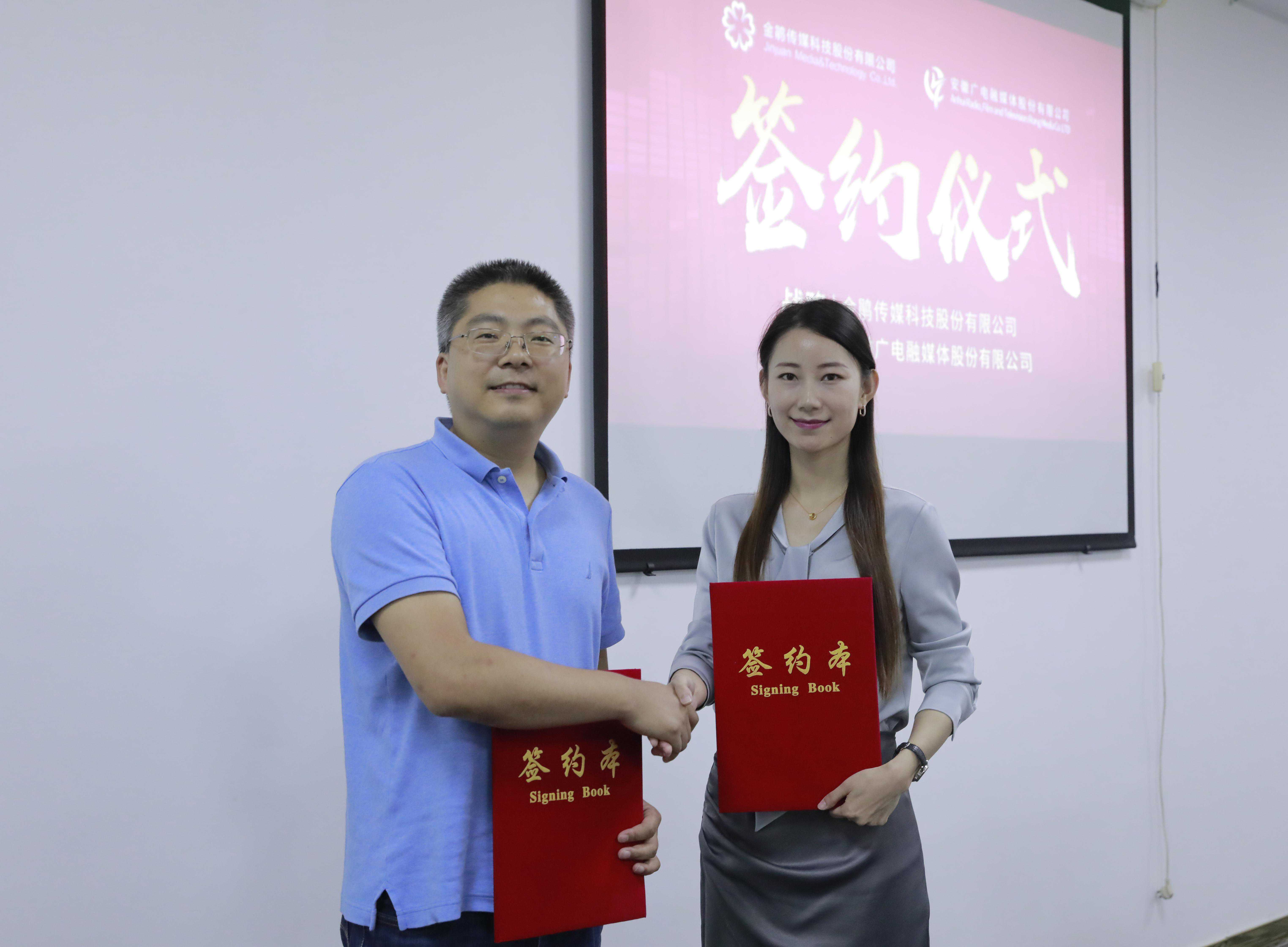 金鹃传媒科技股份有限公司副总经理、安徽广电通传网络科技有限公司董事长路亮与安徽广电融媒体股份有限公司合肥分公司总经理王子兮签署云播基地场地服务合同。