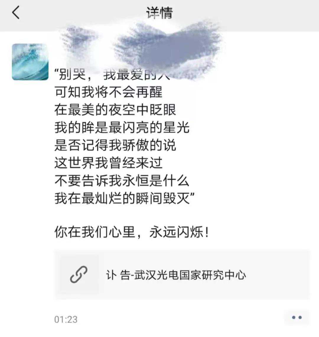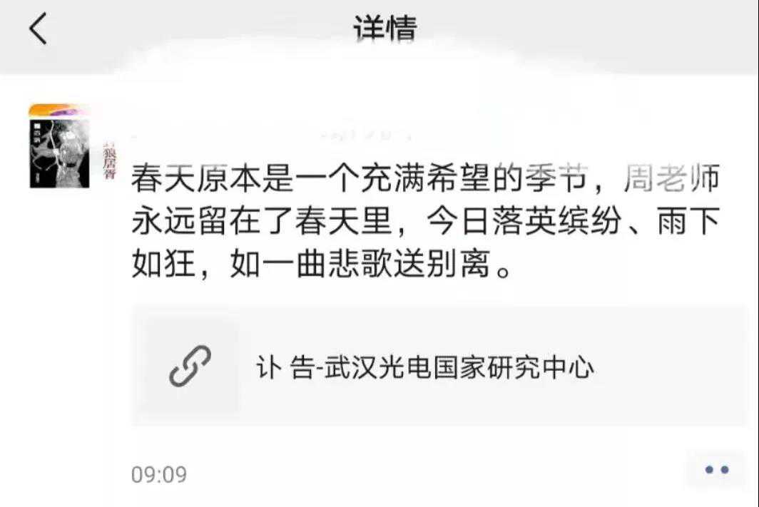 该讣告刷遍了华科师生的朋友圈,该校师生沉痛悼念周军教授。“春天原本是一个充满希望的季节,周老师永远留在了春天里,今日落英缤纷、雨下如狂,如一曲悲歌送别离。”“无比悲痛,沉痛哀悼周老师!愿在天堂一切安好。”