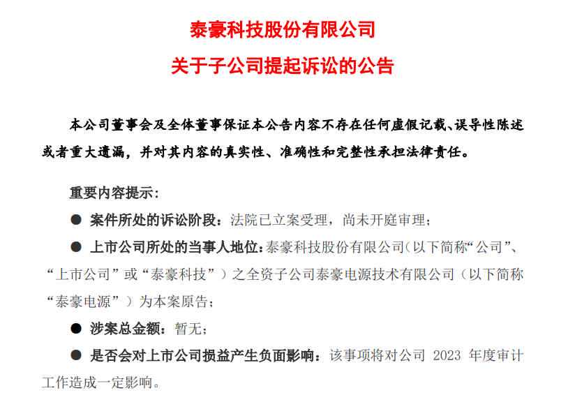 4月13日,泰豪科技公告显示,泰豪电源就德塔动力不配合提供2023年度审计相关资料,侵害股东知情权纠纷向闽侯县人民法院提起诉讼,近日,泰豪电源收到闽侯县人民法院出具《受理案件通知书》。