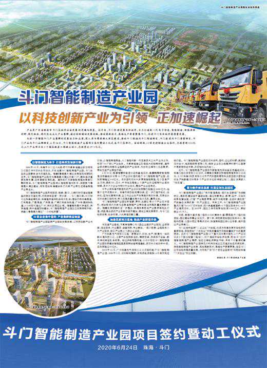 为进一步增强斗门产业集群的发展活力和品质,深入参与粤港澳大湾区建设,推动斗门制造向斗门智造转变、斗门速度向斗门质量转变、斗门产品向斗门品牌转变,6月24日,斗门智能制造产业园项目签约暨动工仪式在斗门区举行。活动现场,12家先进制造企业签约,总投资超110亿元;6个产业项目及2个园区配套工程破土动工,总投资达27.1亿元。