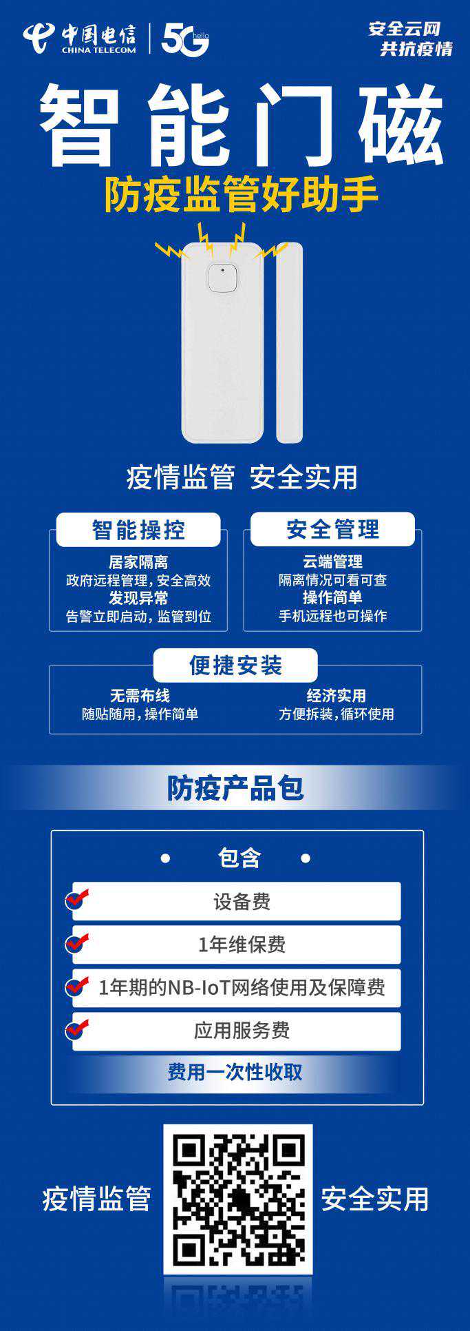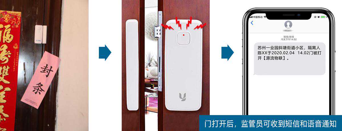 中国电信推出的智能门磁,对有需要隔离的家庭装上NB-IoT智能门磁之后,如果出现开门外出,后台立即生成告警,并第一时间通过短信或语音实时推送到社区网格员手机上,助力社区管理人员迅速做出反应,大大提升了网格员的工作效率,受到基层政府的大力表扬!