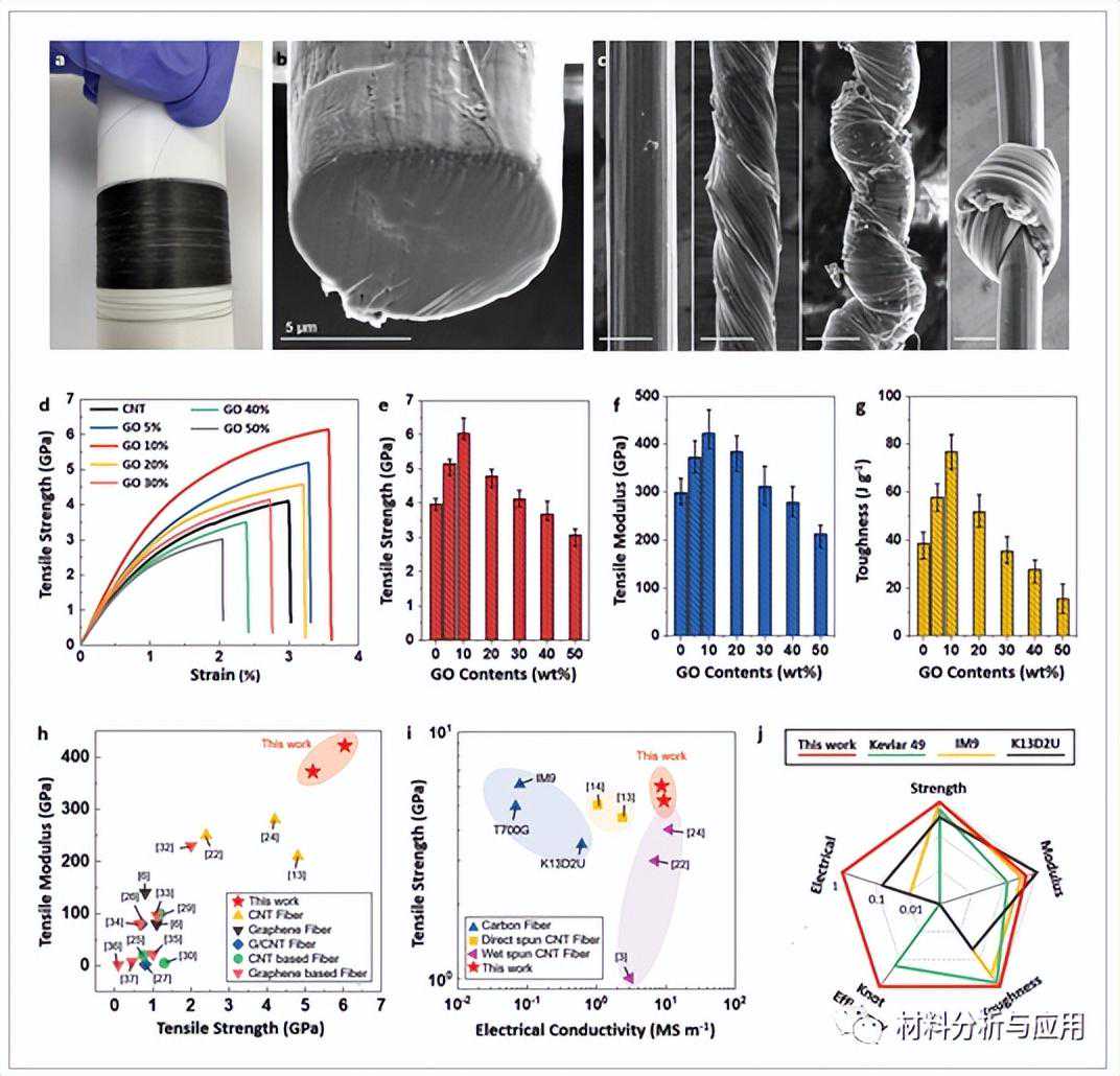 单个碳纳米管(CNT)和石墨烯具有独特的机械和电学性能;然而,由于物理尺寸有限、组件分散程度有限以及各种结构缺陷,它们的宏观组装性能并未达到预期。本文,韩国科学技术研究院Bon-CheolKu等研究人员在《AdvSci》期刊发表名为“UltrastrongHybridFiberswithTunableMacromolecularInterfacesofGrapheneOxideandCarbonNanotubeforMultifunctionalApplications”的论文,研究提出了一种用于新型混合纤维的最先进的组件,该纤维具有多种多功能应用所需的特性。通过溶液处理组装的简单有效的CNT和氧化石墨烯(GO)的多维纳米结构提高了组件的界面利用率。
