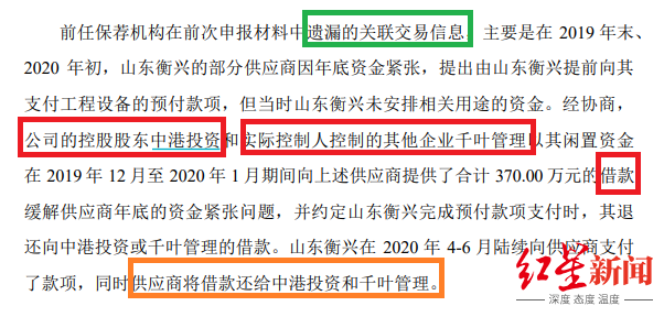 经协商,恒兴科技的控股股东中港投资和实际控制人控制的其他企业千叶管理以其闲置资金在2019年12月至2020年1月期间向上述供应商提供了合计370万元的借款,并约定山东衡兴完成预付款项支付时,其退还向中港投资或千叶管理的借款。山东衡兴在2020年4-6月陆续向供应商支付了款项,同时供应商将借款还给中港投资和千叶管理。
