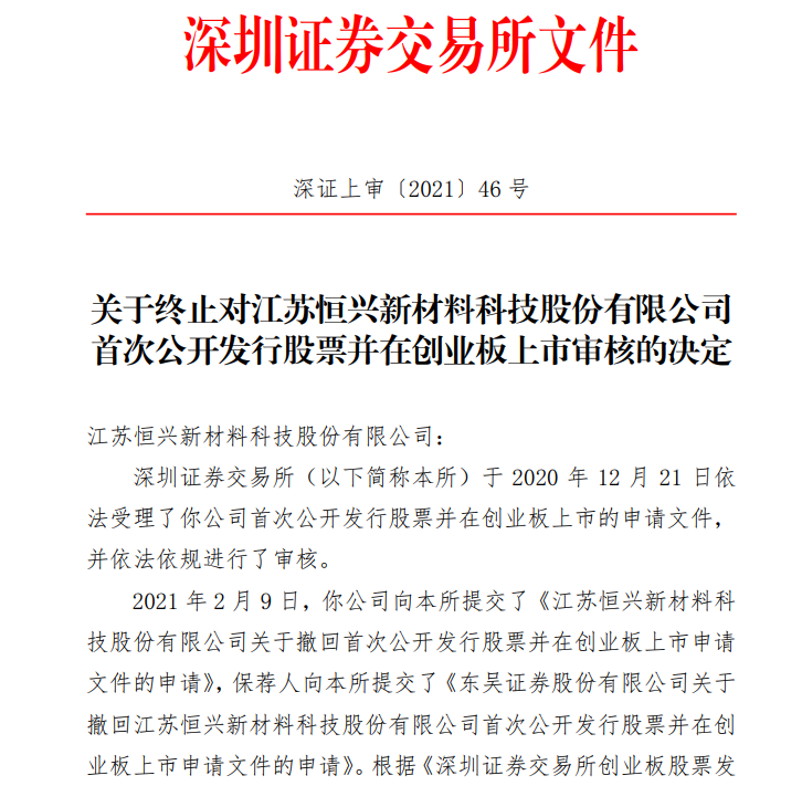2020年12月18日,恒兴科技报送了首次公开发行并在深交所创业板上市的申请,这是恒兴科技第一次冲击IPO,保荐机构为东吴证券。仅仅过了40多天,2021年1月31日恒兴科技被抽中现场检查,2021年2月9日撤回申请文件。次日,深交所决定终止对其首次公开发行股票并在创业板上市的审核。