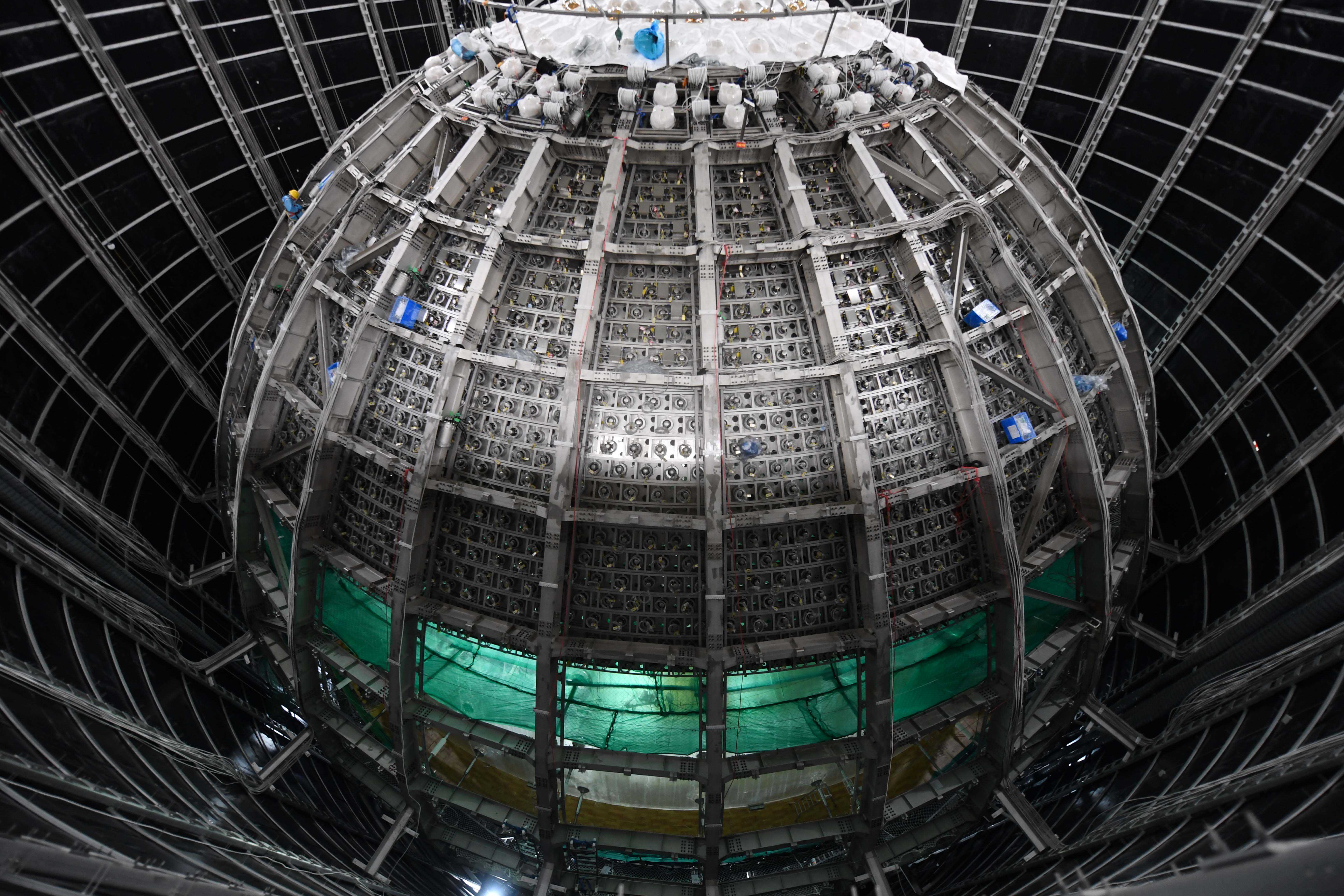 位于地下700米的江门中微子实验探测器呈现巨大的球形结构(6月14日摄)。新华社记者邓华摄