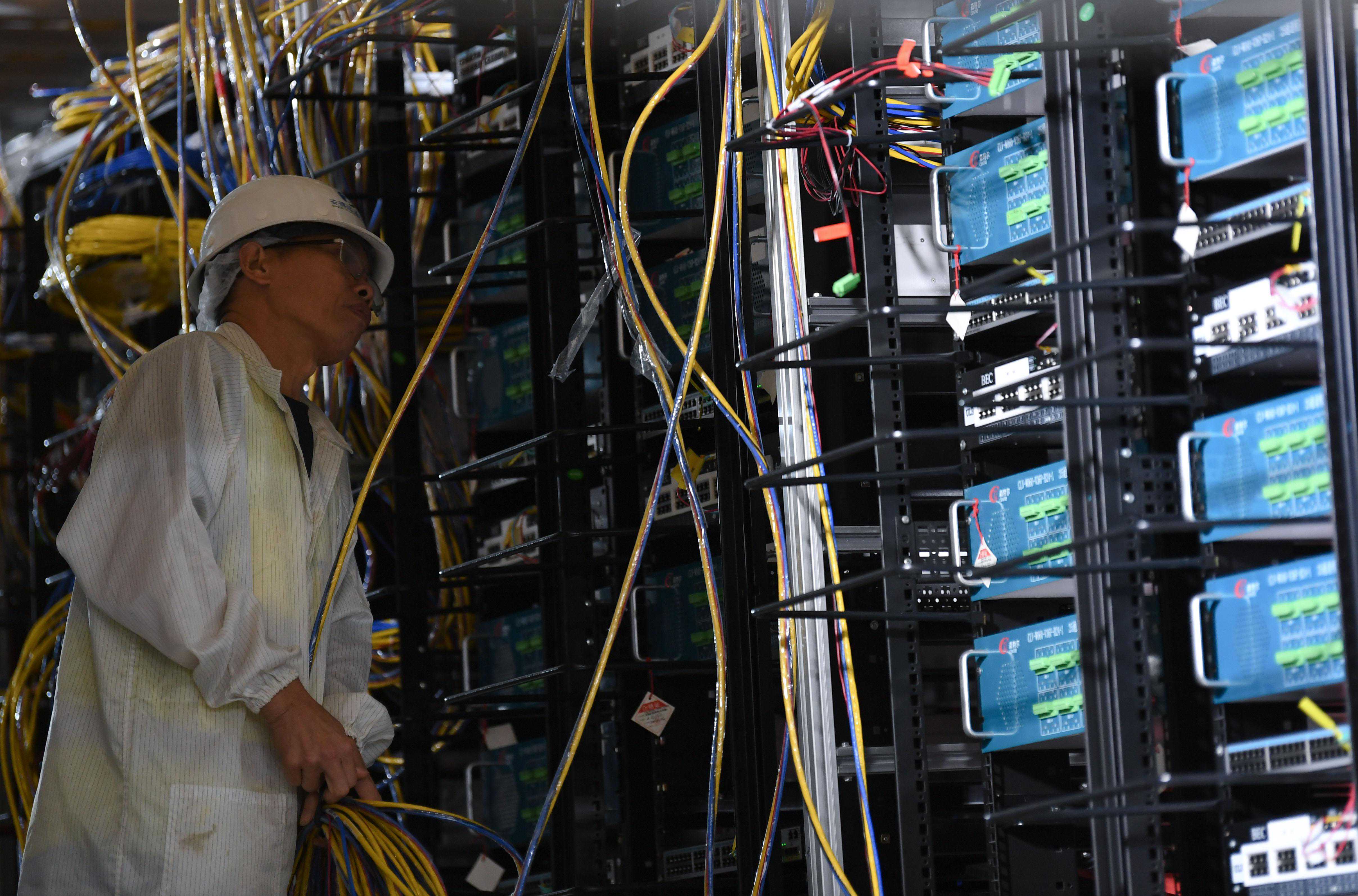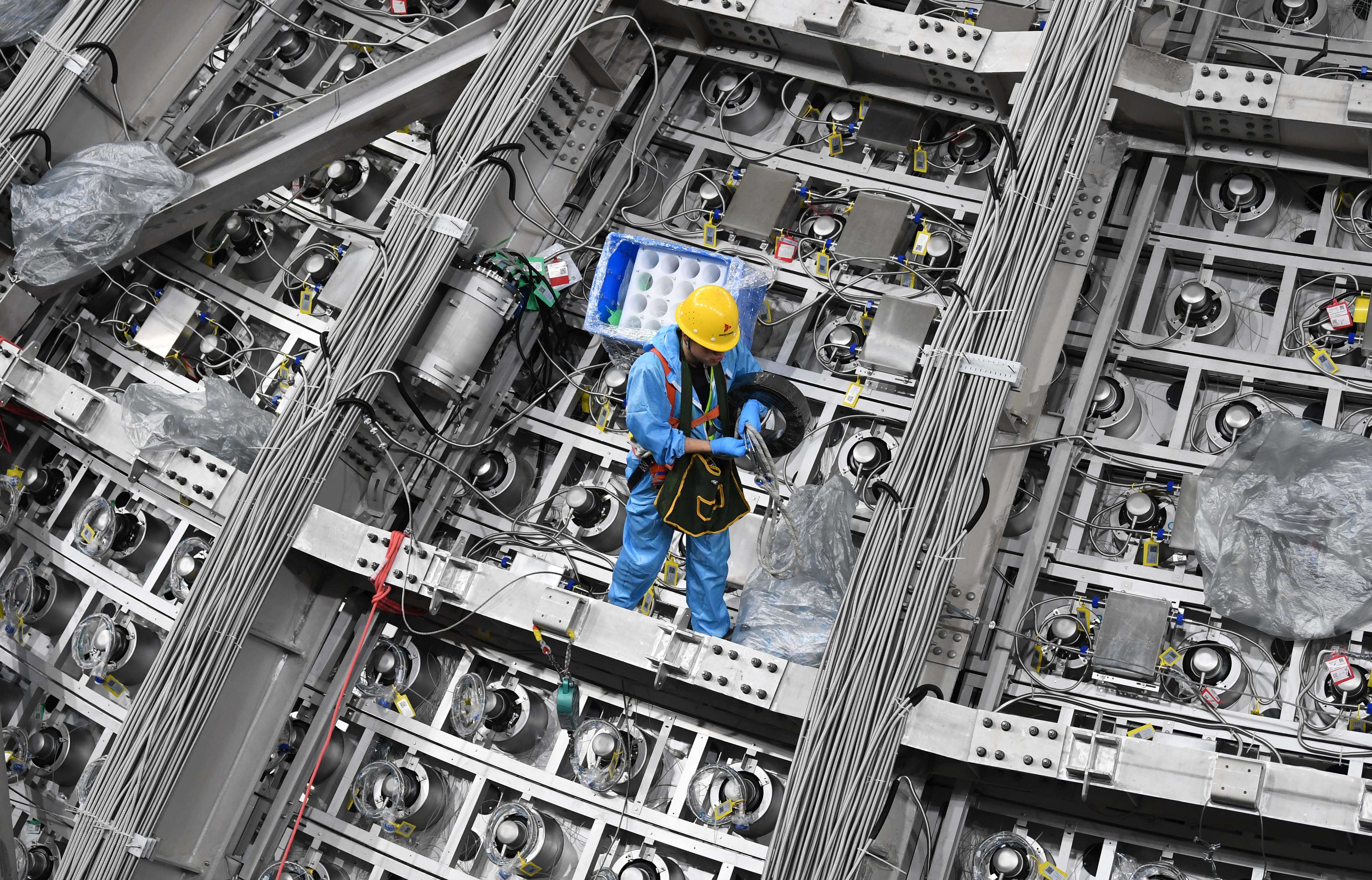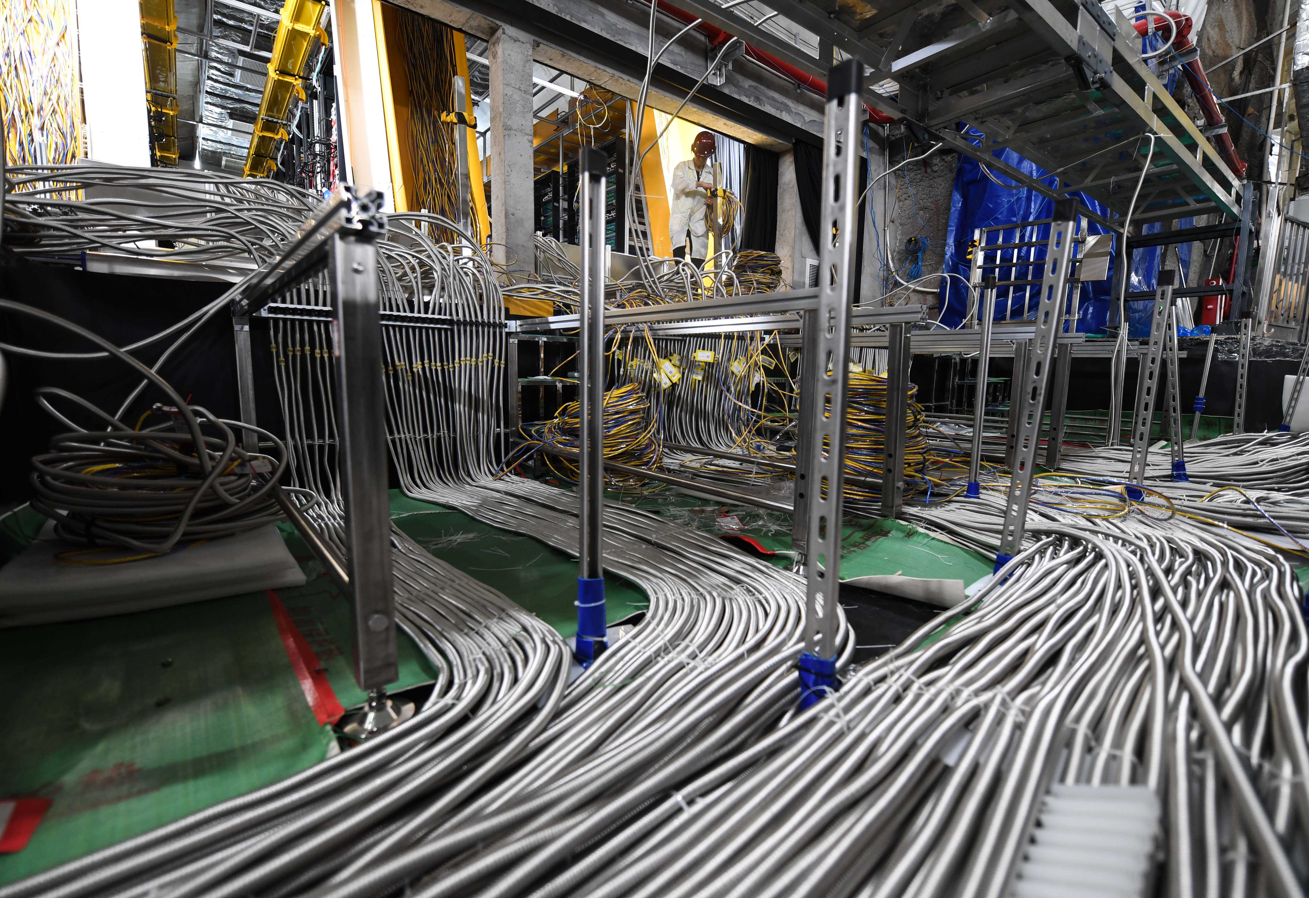 6月15日,工作人员在江门中微子实验地下大厅内布线。新华社记者邓华摄