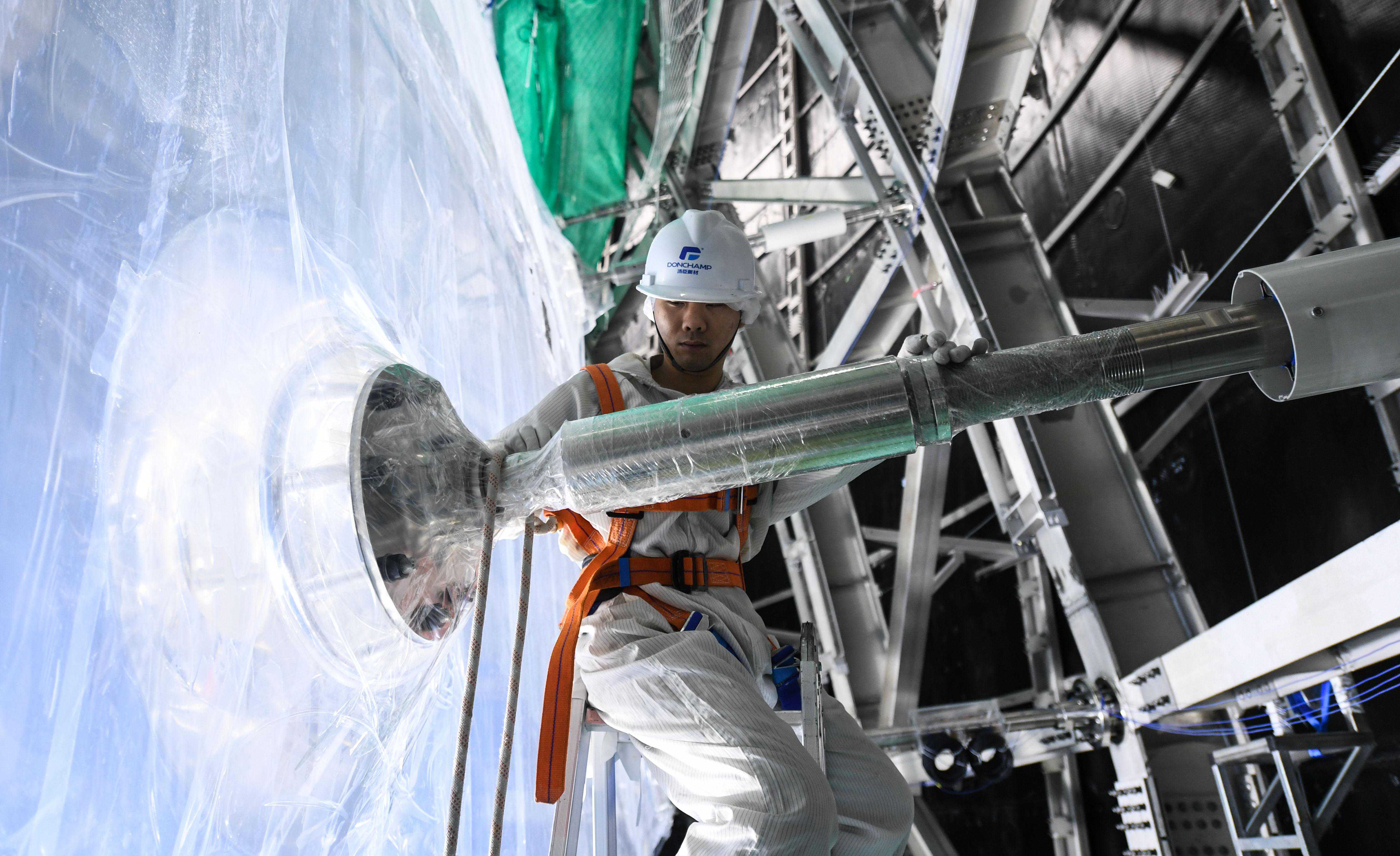 6月15日,工作人员在江门中微子实验探测器内部的安装工作平台上调试设备。新华社记者邓华摄