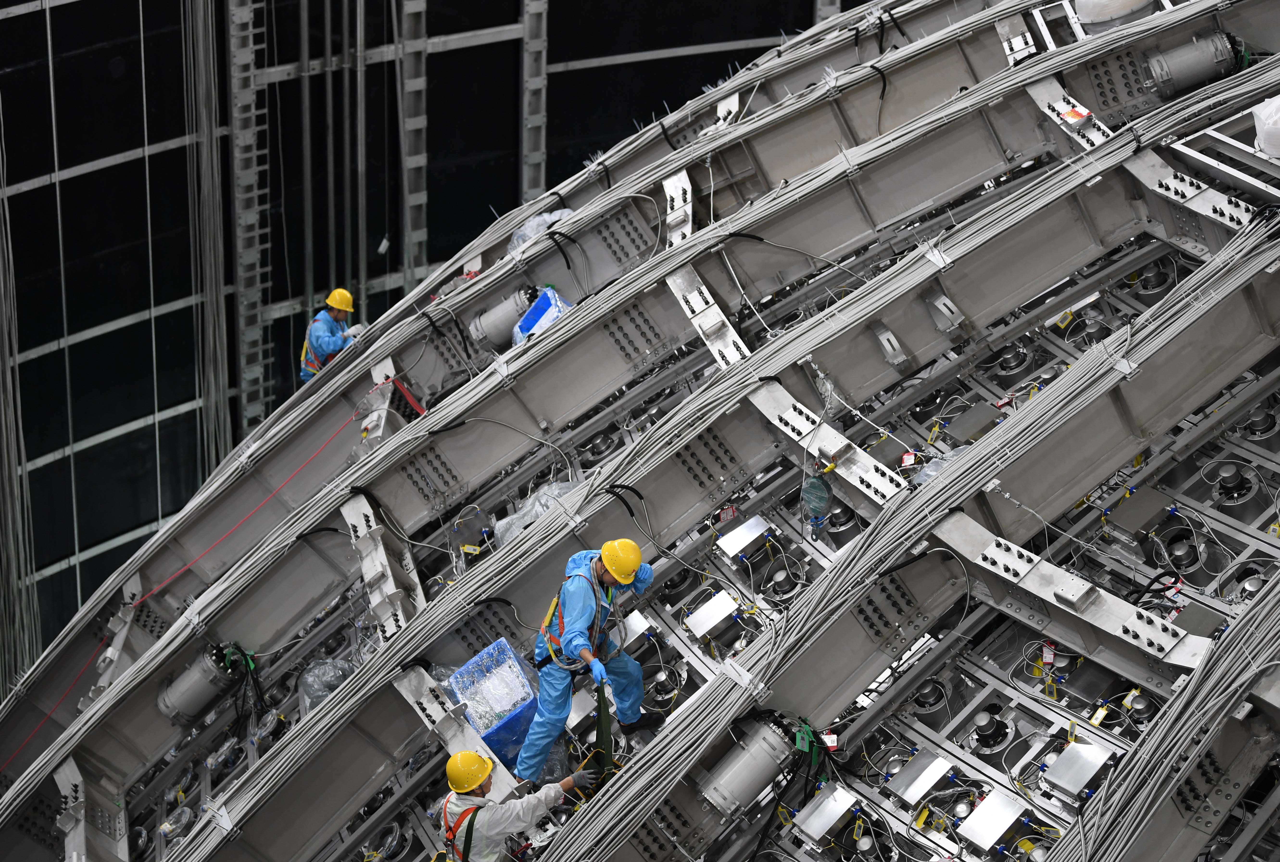 6月15日,工作人员在江门中微子实验探测器的不锈钢结构上进行安装作业。新华社记者邓华摄