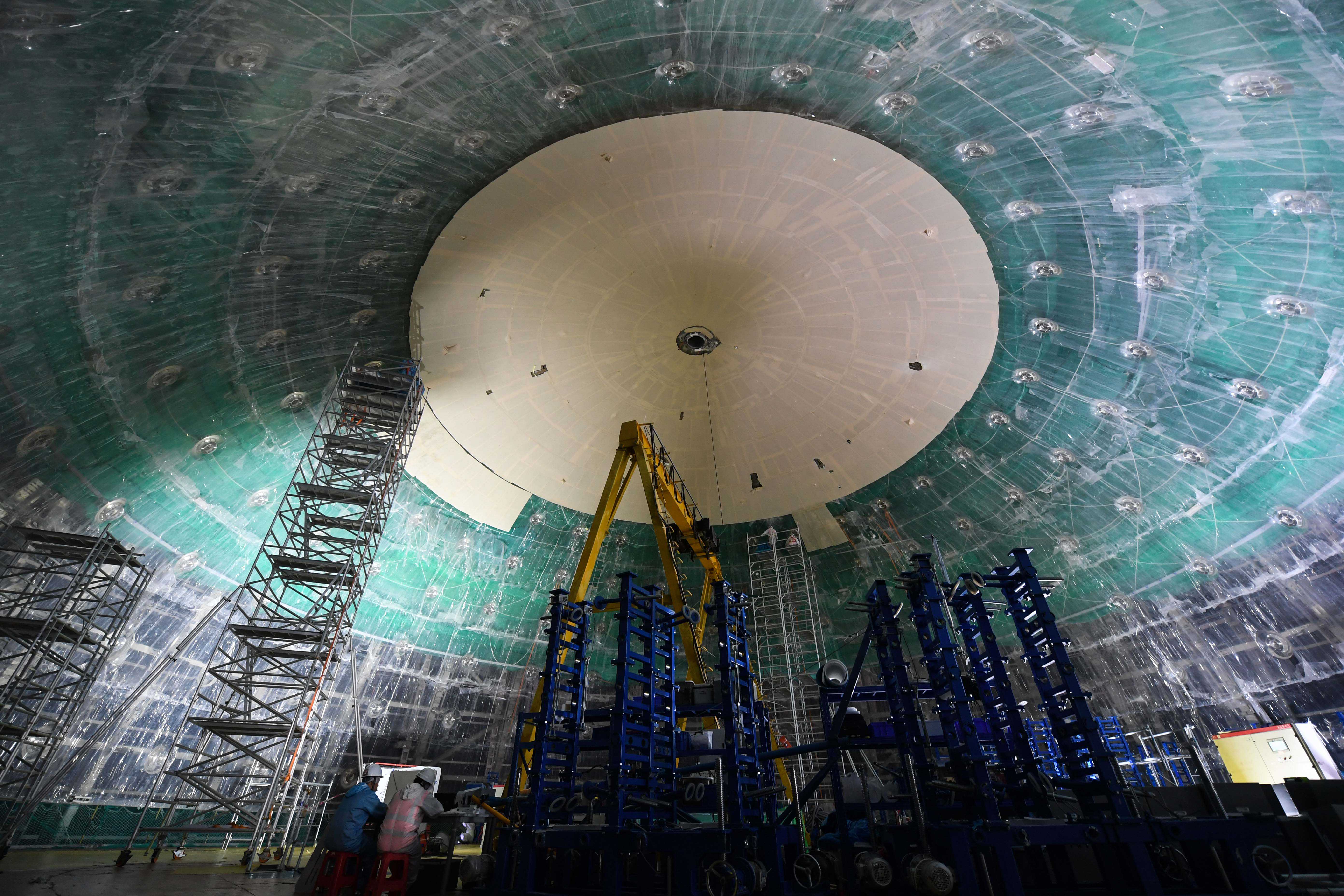 6月15日拍摄的江门中微子实验探测器内部的安装工作平台。新华社记者邓华摄