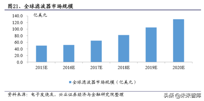 2020年全球滤波器市场规模可达130亿美元。高通公司预测,滤波器市场将由2015年的50亿美金的市场规模增长至2020年的130亿美金。另据MobileExperts预测,滤波器市场将由2015年的50亿美金增长至2020年的120亿美金。MobileExperts的预测与高通基本一致。