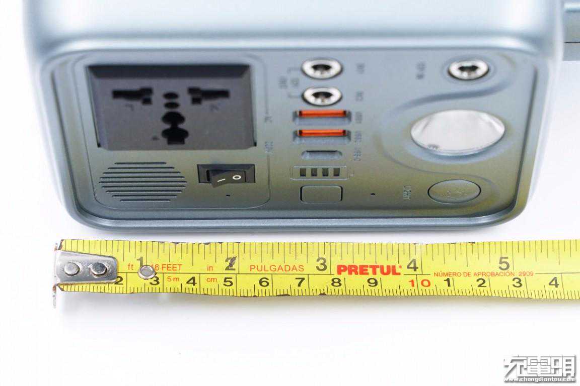 机身一端从左往右:最上一排是DC输入接口、照明灯以及对应的开关键;中间一排是两个DC输出接口、2A1C三个USB接口、电量指示灯以及区域通电单独控制按键;最下一排是AC输出插孔和总开关。