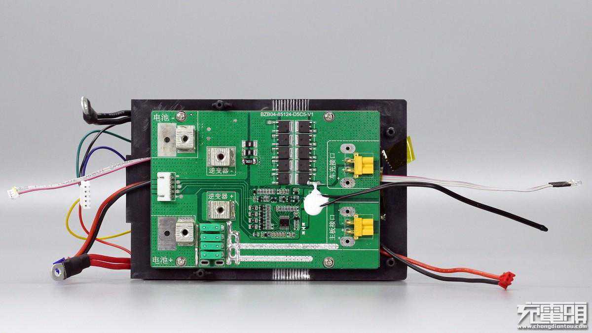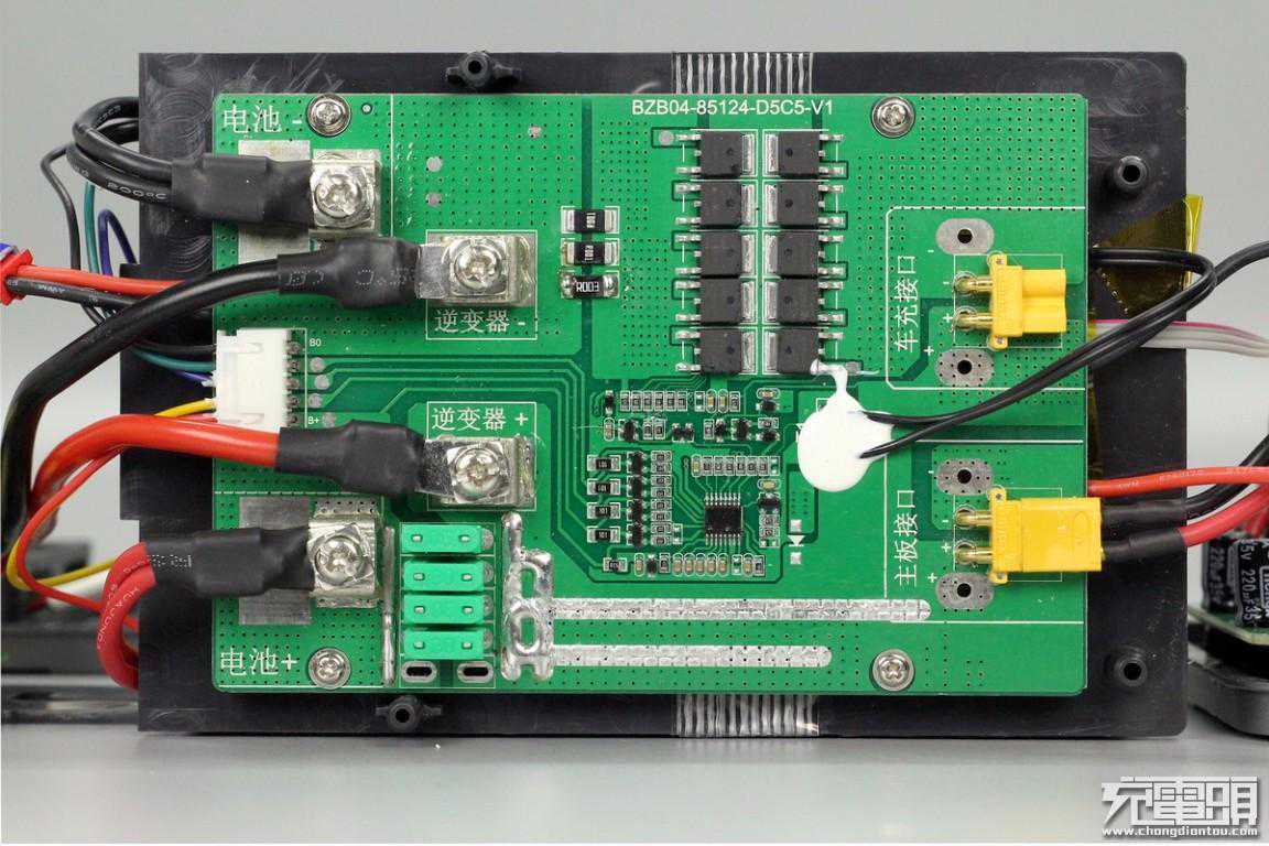 逆变器电路板通过导线直接连接到电池端,通过并联的绿色保险丝保护。