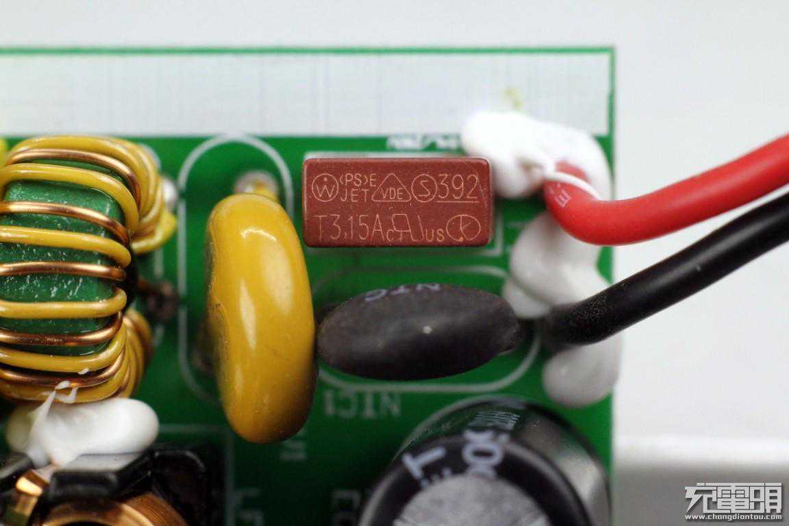 充电模块输入有保险丝,NTC浪涌抑制电阻和压敏电阻保护,保险丝额定电流3.15A。
