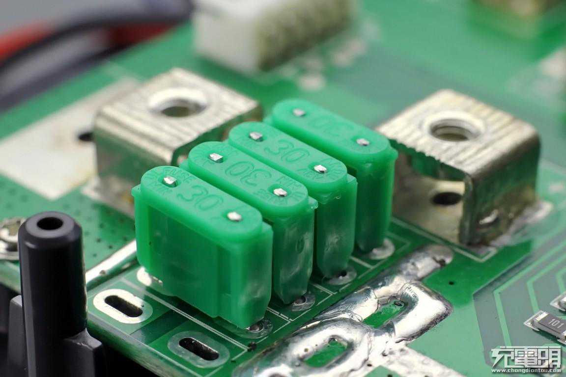 四颗30A保险丝并联焊接,用于电池组过流保护。