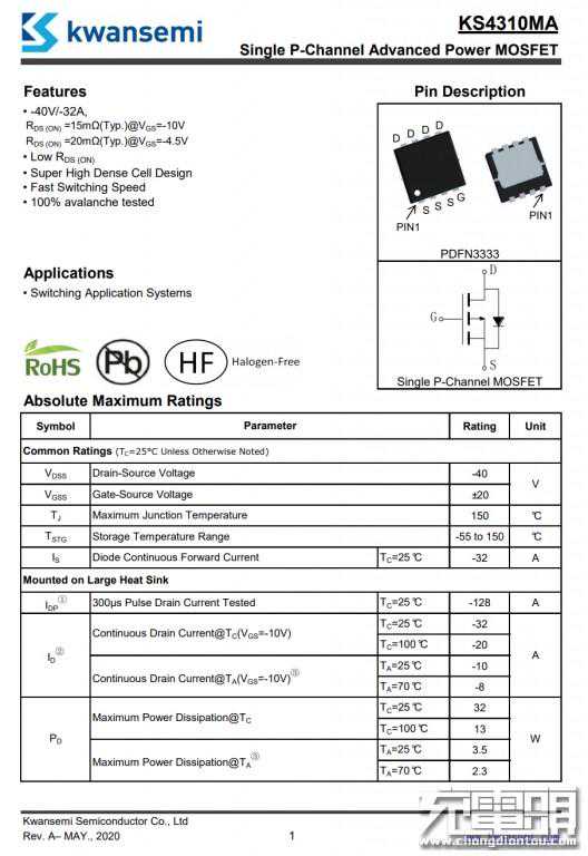 冠禹半导体KS4310MA,PMOS,-40V/-32A,PDFN3333封装,用于端口切换。