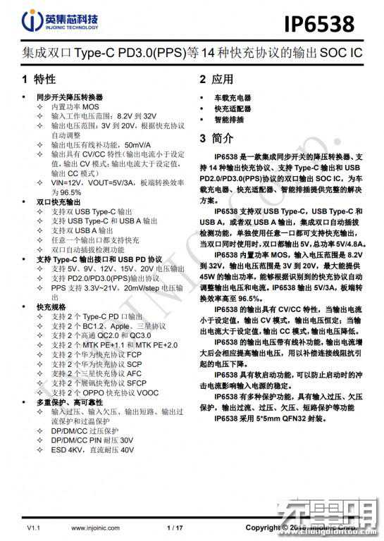 双USB-A口输出采用英集芯IP6538,这是一款集成同步开关的降压转换器、支持14种输出快充协议、支持Type-C输出和、(PPS)协议的双口输出SOCIC,为车载充电器、快充适配器、智能排插提供完整的解决方案。IP6538输入电压最高32V,耐压40V,8.2V自动关闭防止电瓶过放。数据脚支持过压保护,且IP6538具有完善的保护功能。