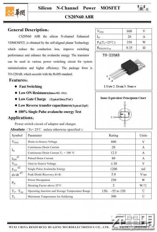 华润微CS20N60NMOS,耐压600V,20A电流,导阻0.35Ω,用于交流输出调制,TO220封装。