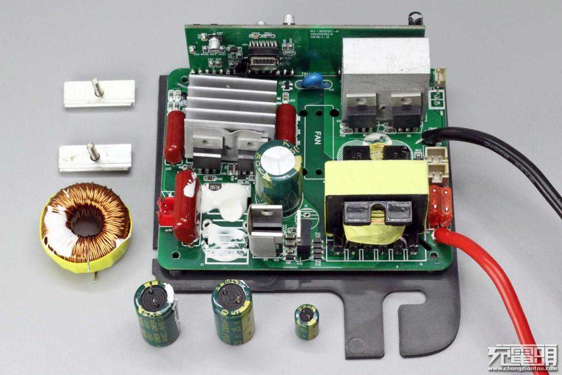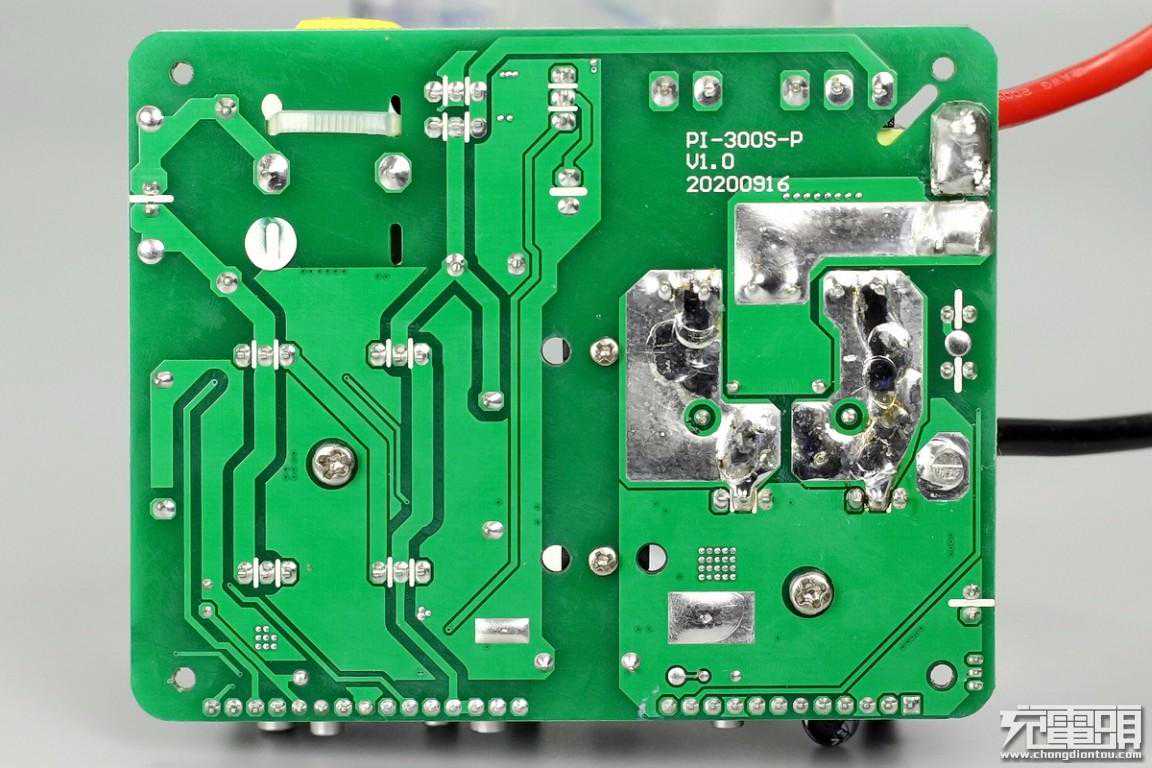 保护板正面一览,电池和逆变器大电流接口采用螺丝固定。保护板支持电池组均衡,两个输出口采用XT30焊接,主板接口负责USB输出和充电,这款户外电源没有车充接口,故保护板上车充接口未连接。