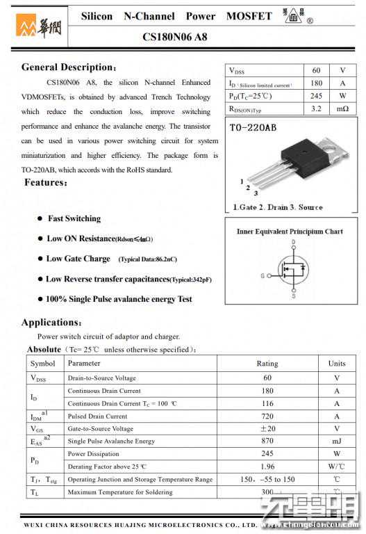 华润微CS180N06NMOS,耐压60V,180A电流,导阻3.2mΩ,用于逆变器电池端升压,TO220封装。