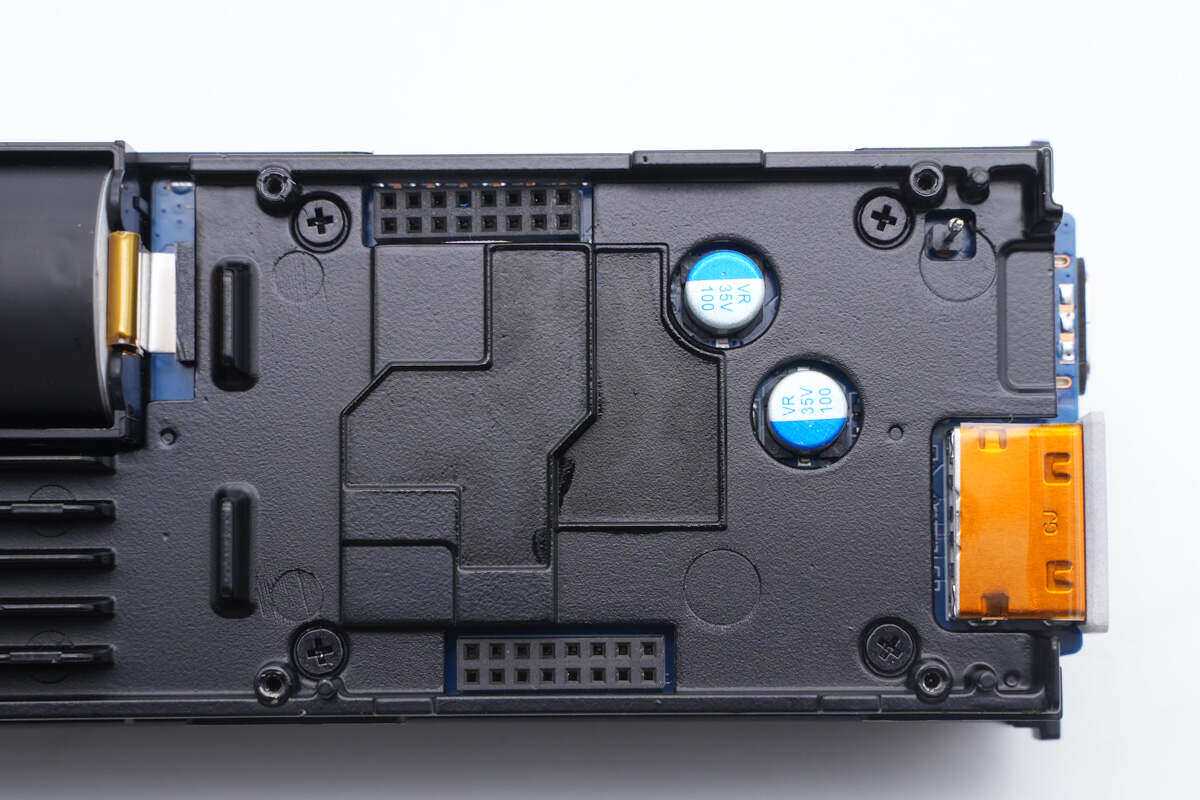 PCBA模块正面一览,采用螺丝固定,正面一颗合金电感周围打胶填充。右侧上方为一体式散热片,连接到PCB模块。下方为单独的一节电池,粘贴黑色胶带装饰。