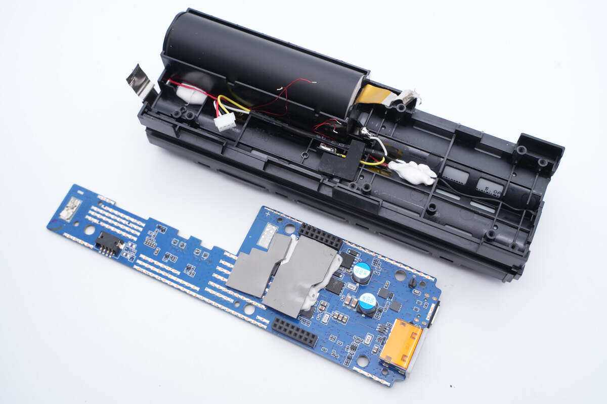 从壳体内部抽出电池组和PCBA模块,屏幕模块和PCBA模块通过排线连接。
