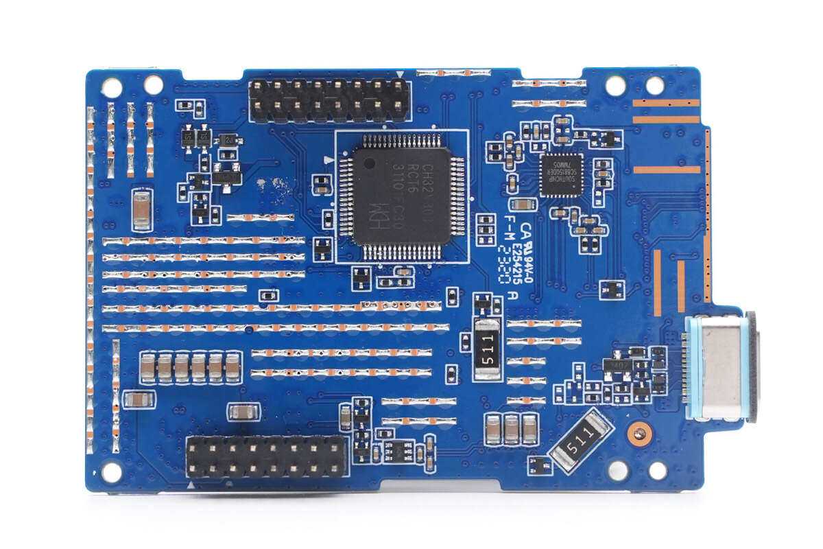 主控MCU来自沁恒,型号CH32V303RCT6,是基于32位RISC-V指令集及架构设计的工业级通用增强型MCU,内置64KSRAM和256KFlash,主频为144MHz,具备I2C,I2S,SPI,USART,SDIO,CAN控制器等接口。