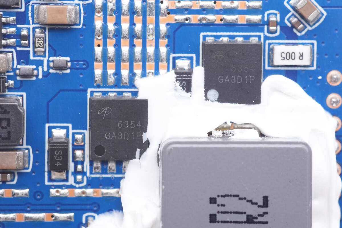 2.2μH合金电感和两侧的同步升降压开关管特写。