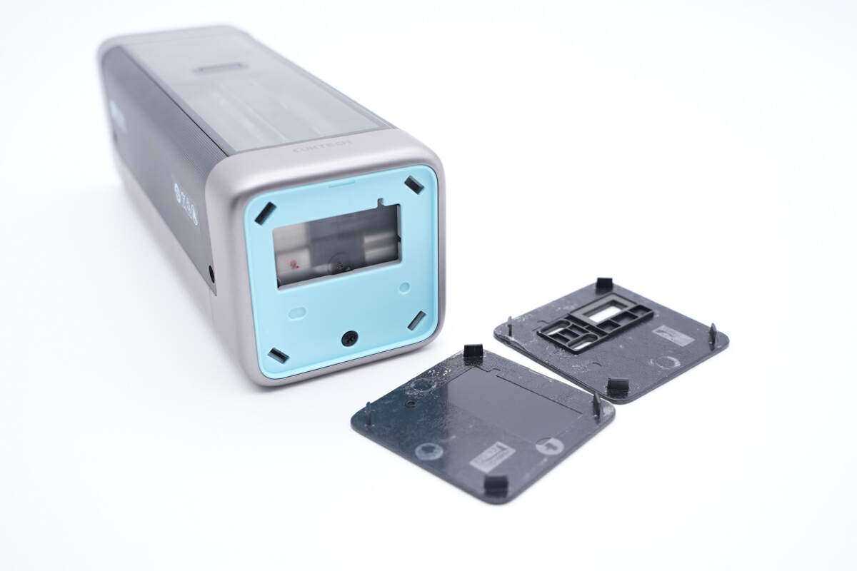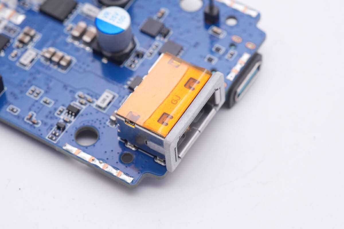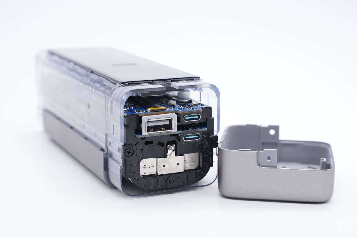 面板内部为USB-C和USB-A接口,还有连接电池的镍片。