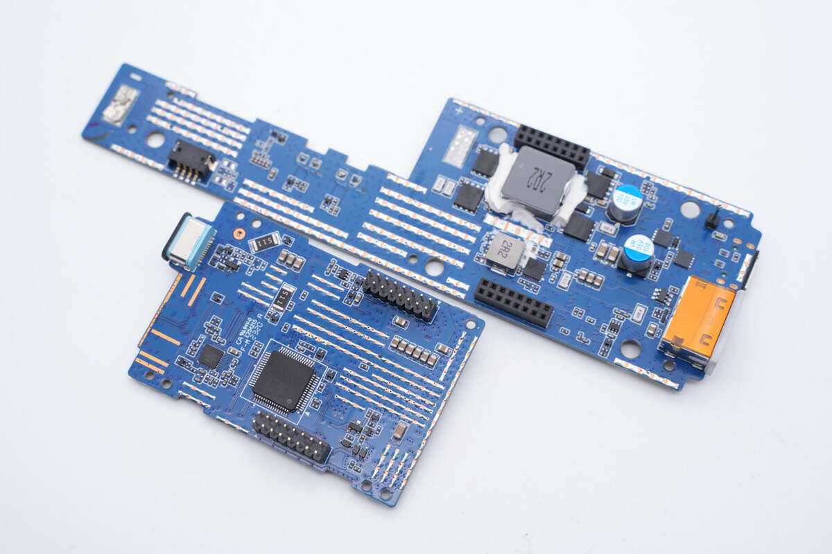 这款充电宝内置三路同步升降压电路,其中两路USB-C口采用南芯科技SC8815同步升降压控制器,升降压开关管均来自AOS万代。USB-A口采用南芯科技SC8721升降压转换器,并采用沁恒CH32V303RCT6MCU用于状态显示,同时采用ABOV协议芯片进行三口协议控制。