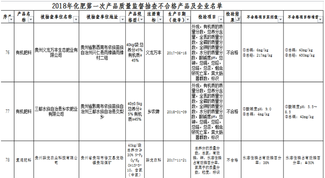 中国网财经7月17贵州省质量技术监督局官网昨日公告2018年化肥第一次产品质量监督抽查结果。本次抽查涉及贵阳市、遵义市、六盘水市、安顺市、毕节市、铜仁市、黔东南州、黔南州、黔西南州和威宁县68家企业生产的化肥产品80个批次。5家企业生产的5个批次产品质量检验不合格,问题产品检出率为6.3%,问题企业发现率为7.4%。