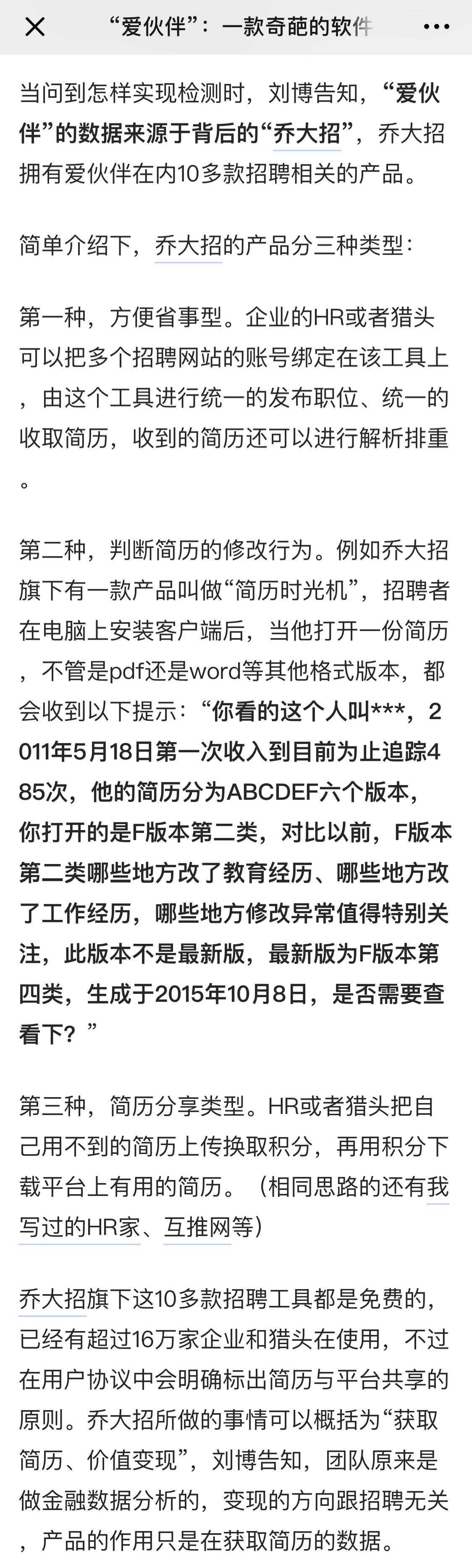 报道指出,爱伙伴是一款提供“员工离职预测”的工具软件,该软件可以检测到员工投递简历、员工简历更新情况以及员工简历被查看次数等信息。企业用户购买爱伙伴后,即可查看其收集汇总的简历数据,依此判断公司员工的离职倾向。