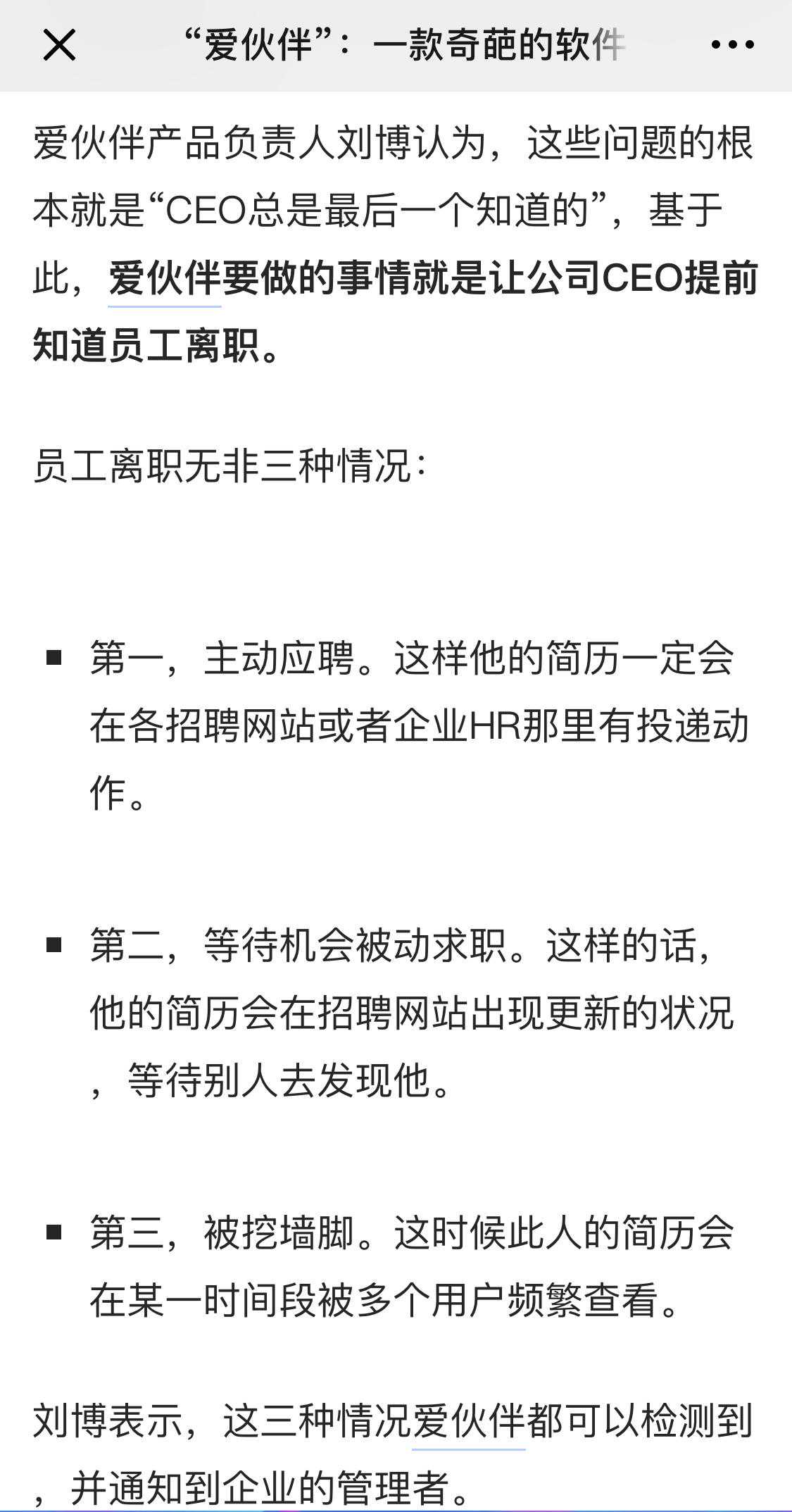 在调查过程中,三言财经搜索到一篇发表于2015年的题为《“爱伙伴”:一款奇葩的软件,能帮CEO预报员工离职》的报道。该文章详细讲述了“爱伙伴”的产品功能。