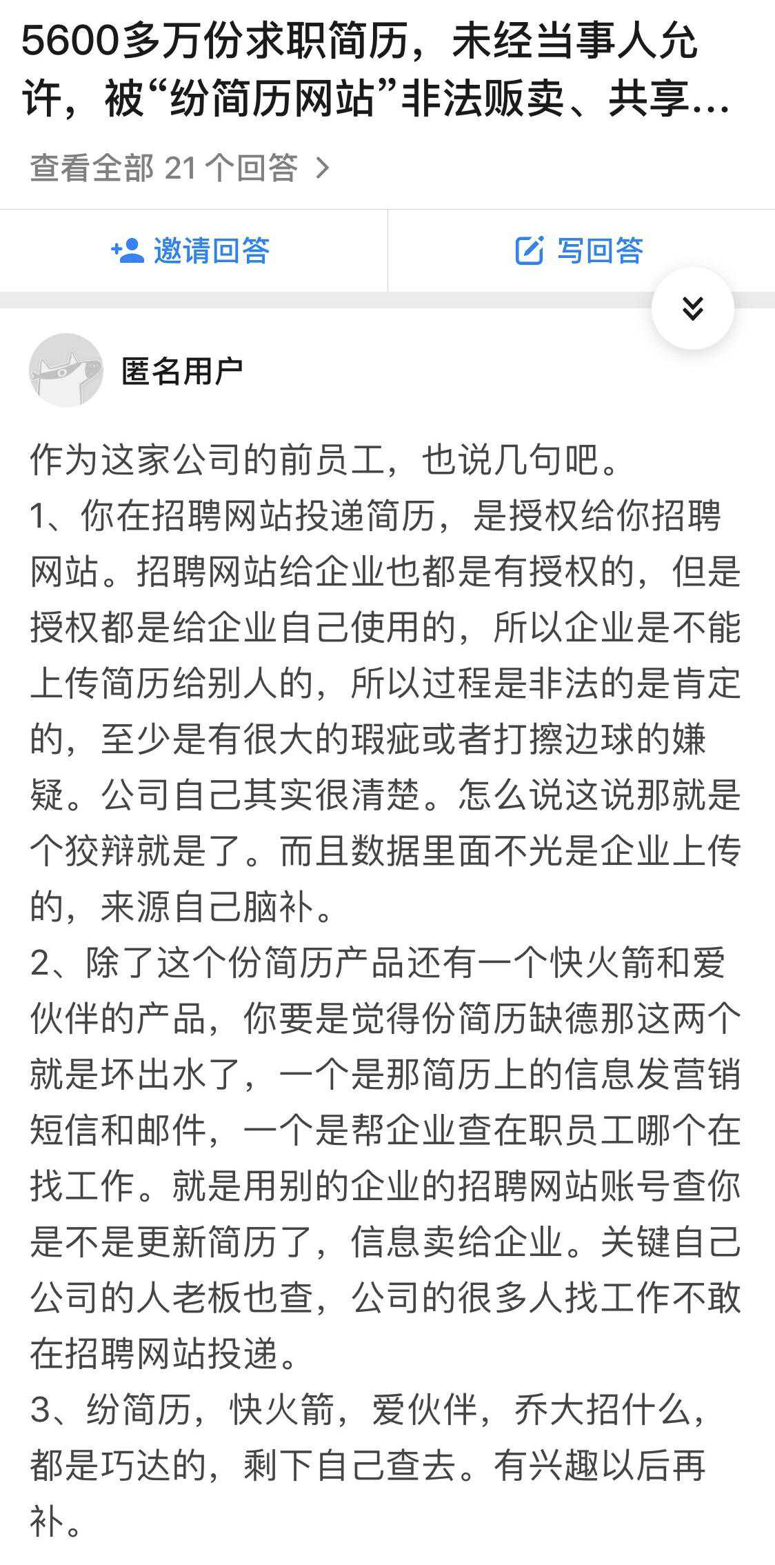 据悉,“纷简历”也是一家提供“共享简历”数据的平台,为企业用户收集和共享简历数据。在知乎该问题下,一名自称为“纷简历”前员工的匿名网友则指出像纷简历和爱伙伴这类产品的行为涉嫌违法。